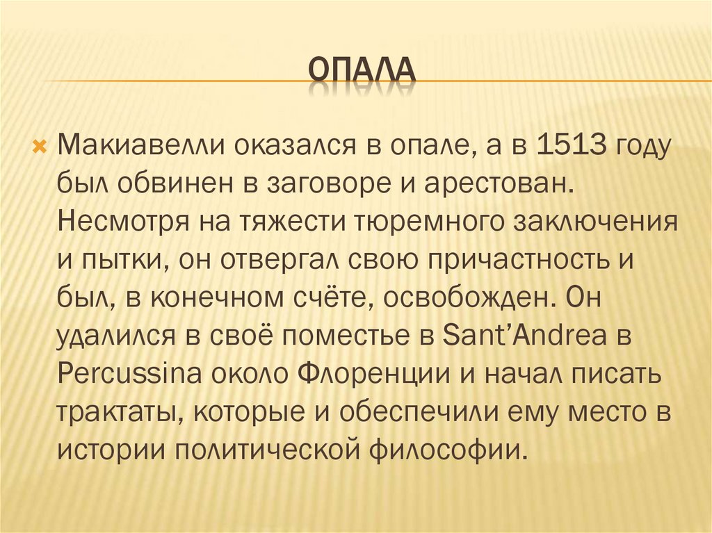 ОПАЛАМакиавелли оказался в опале, а в 1513 году