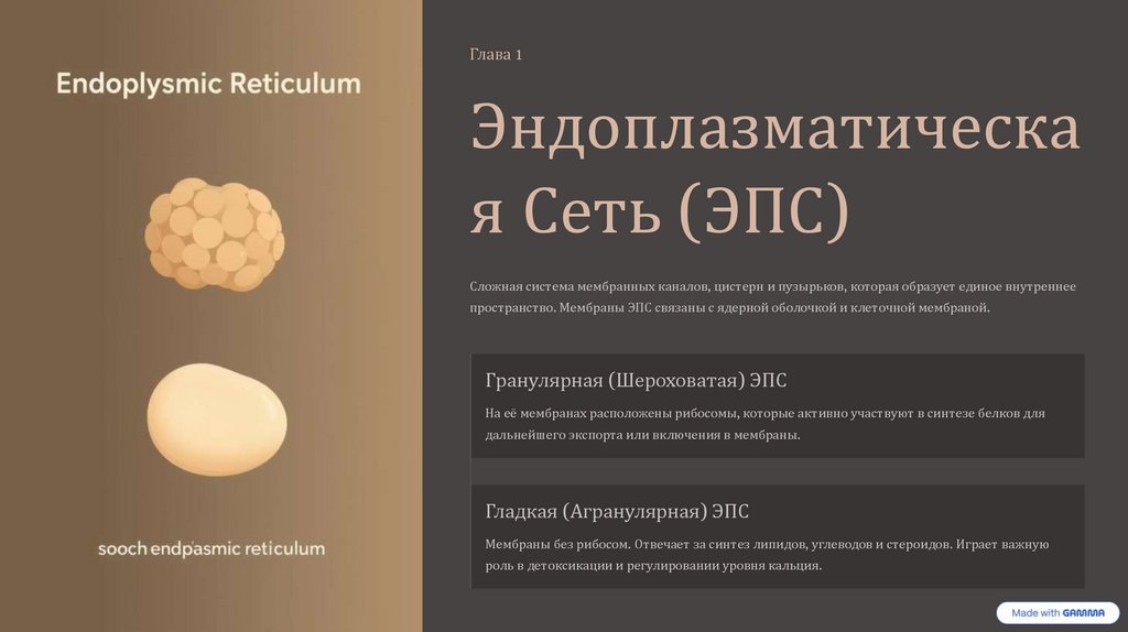 Мембраны без рибосом. Отвечает за синтез липидов, углеводов и стероидов. Играет важную