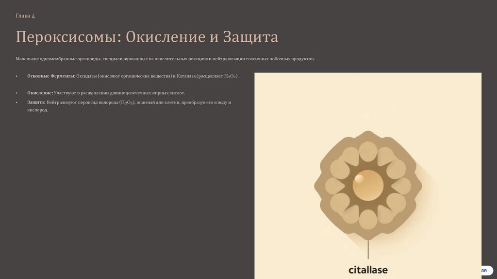 Защита: Нейтрализуют пероксид водорода (H₂O₂), опасный для клетки, преобразуя его в воду и