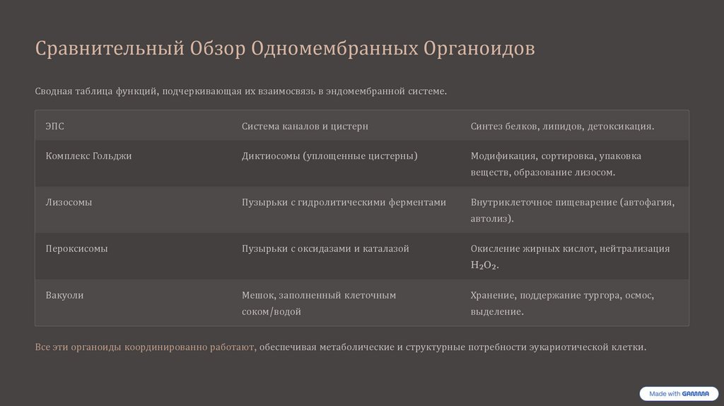 Сравнительный Обзор Одномембранных ОрганоидовСводная таблица функций, подчеркивающая их взаимосвязь в эндомембранной системе.