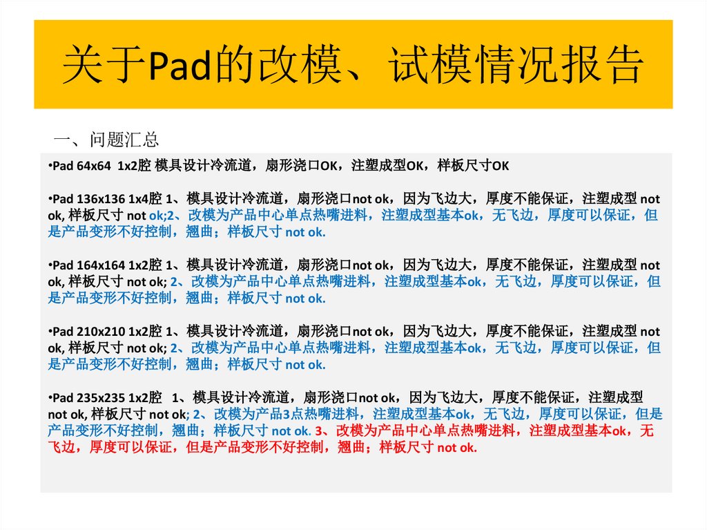 •Pad 164x164 1x2腔 1、模具设计冷流道 扇形浇口not ok 因为飞边大 厚度不能保证 注塑成型 not