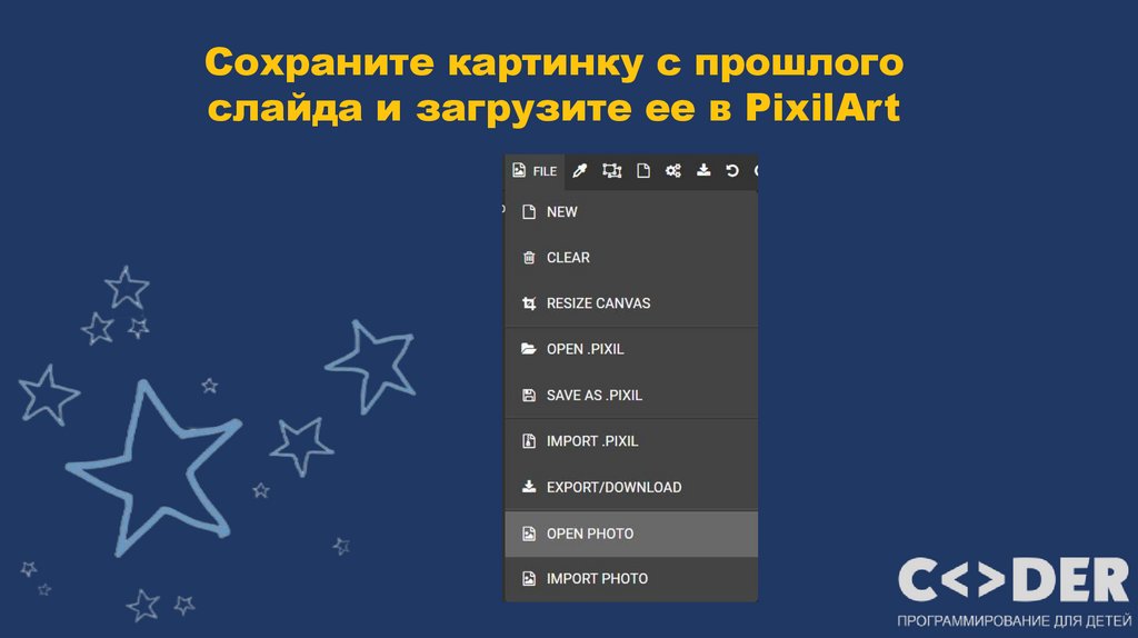 Сохраните картинку с прошлогослайда и загрузите ее в PixilArt