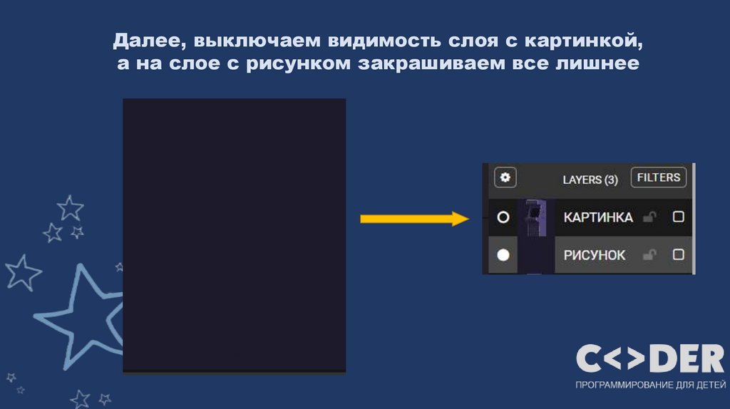 Далее, выключаем видимость слоя с картинкой,а на слое с рисунком закрашиваем все лишнее