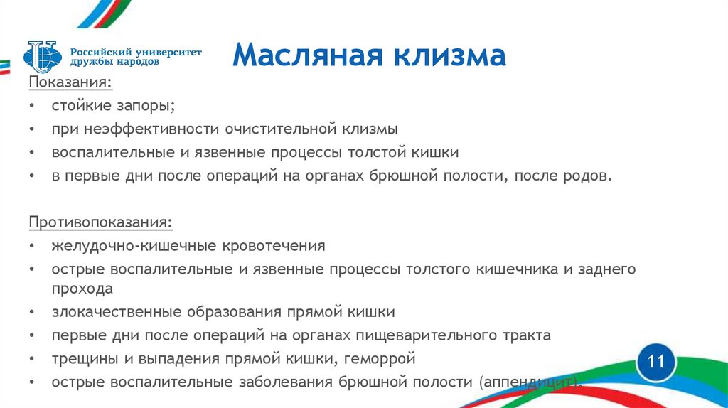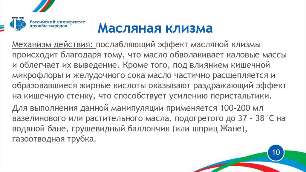 Масляная клизмаМеханизм действия: послабляющий эффект масляной клизмы