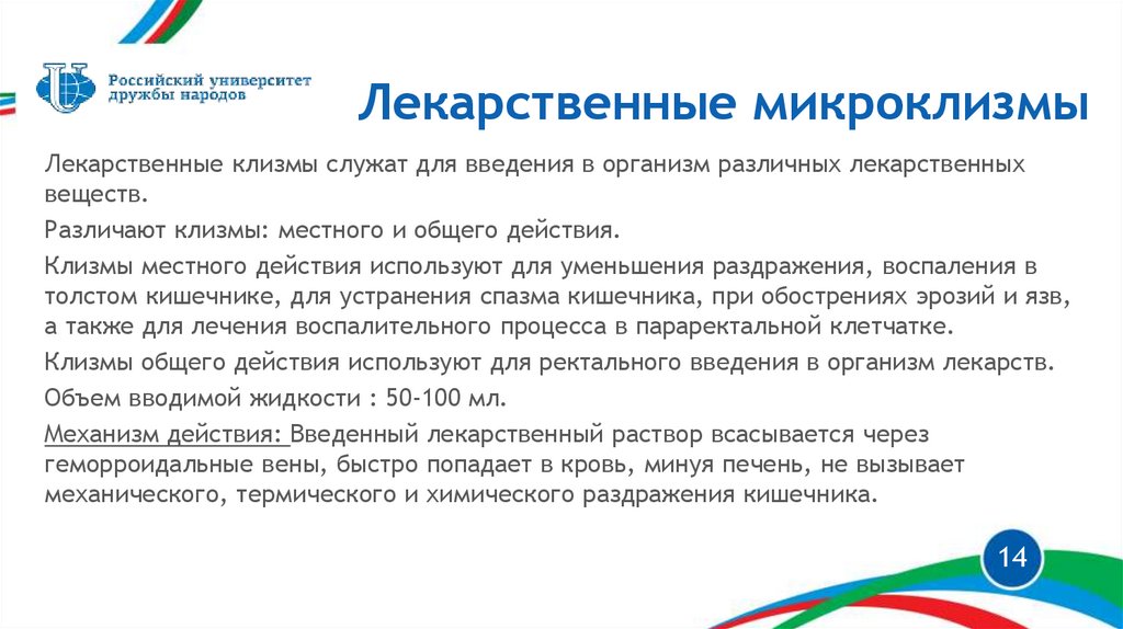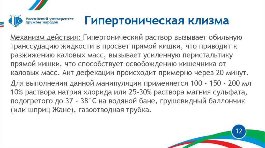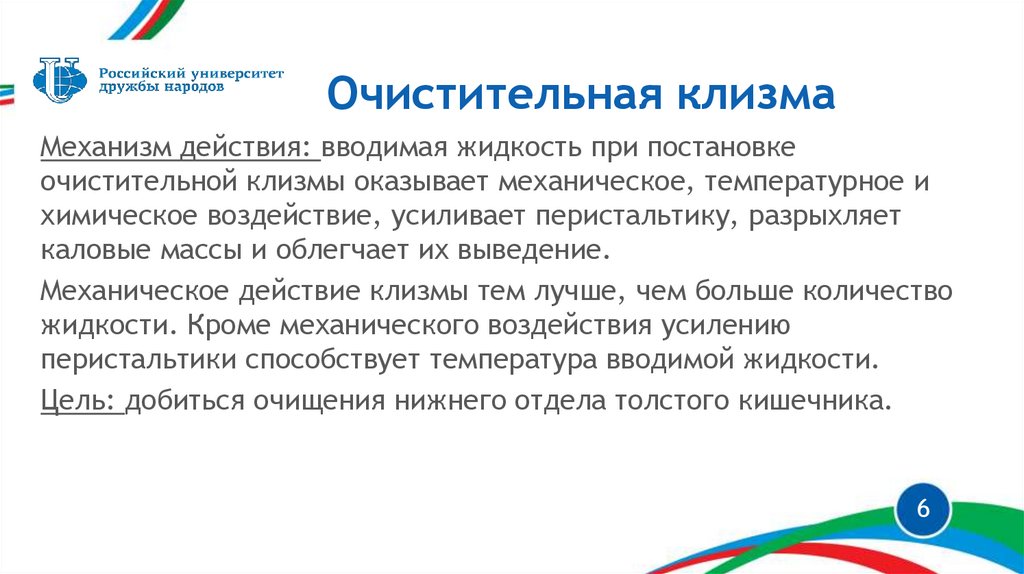 Очистительная клизмаМеханизм действия: вводимая жидкость при постановке