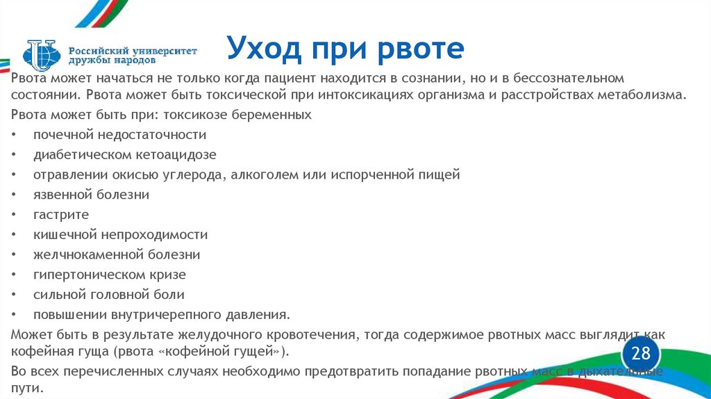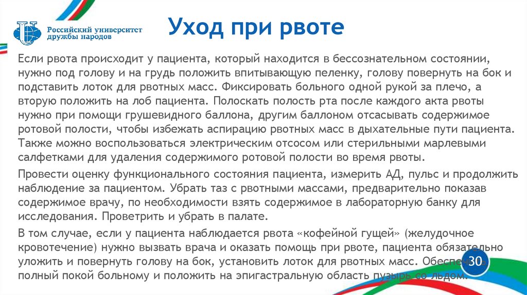 Уход при рвотеЕсли рвота происходит у пациента, который находится в бессознательном состоянии,