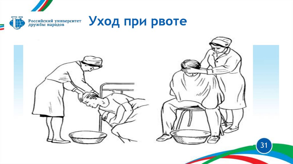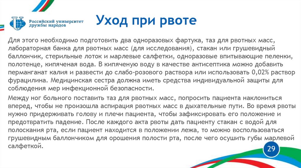 Уход при рвотеДля этого необходимо подготовить два одноразовых фартука, таз для рвотных масс,