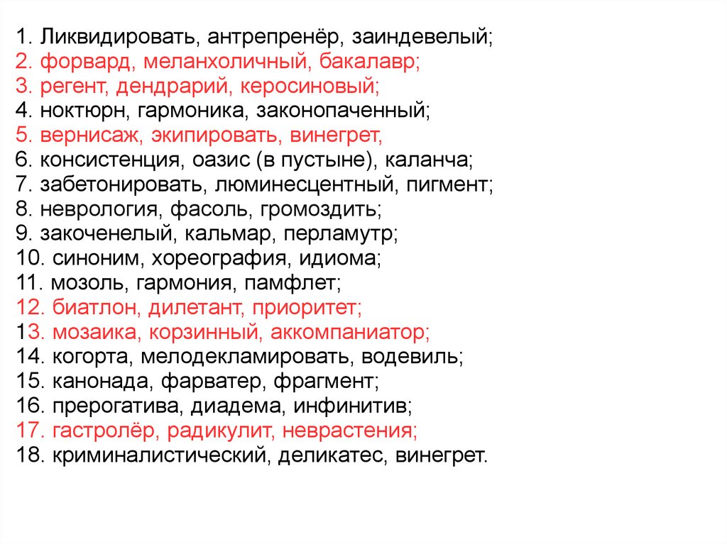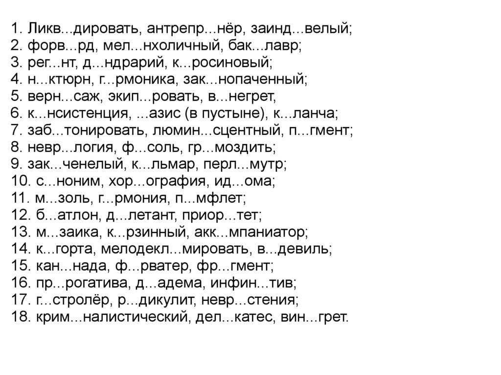 1. Ликв...дировать, антрепр...нёр, заинд...велый;2. форв...рд, мел...нхоличный, бак...лавр;