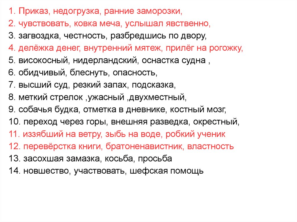 1. Приказ, недогрузка, ранние заморозки,2. чувствовать, ковка меча, услышал явственно,
