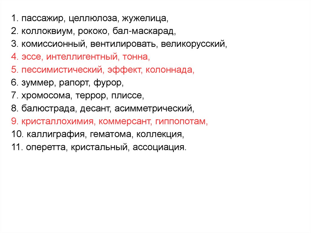 1. пассажир, целлюлоза, жужелица,2. коллоквиум, рококо, бал-маскарад,
