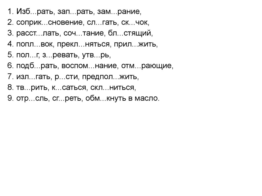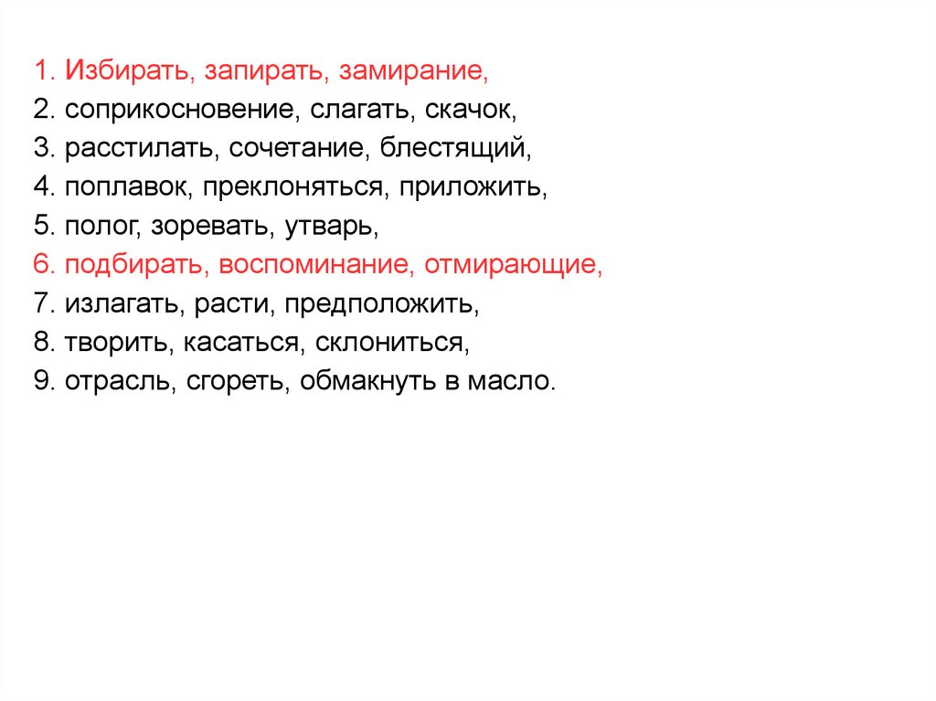1. Изб...рать, зап...рать, зам...рание,2. соприк...сновение, сл...гать, ск...чок,
