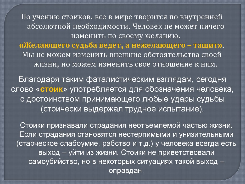 По учению стоиков, все в мире творится по внутреннейабсолютной необходимости. Человек не может ничего