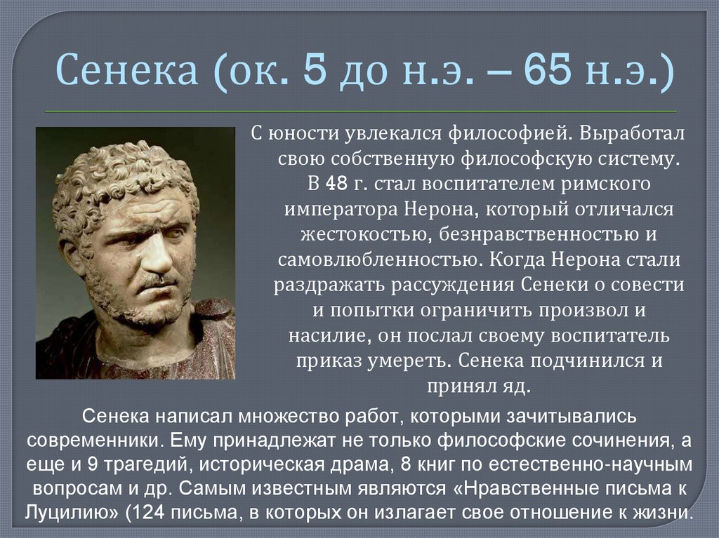 Сенека (ок. 5 до н.э. – 65 н.э.)С юности увлекался философией. Выработал