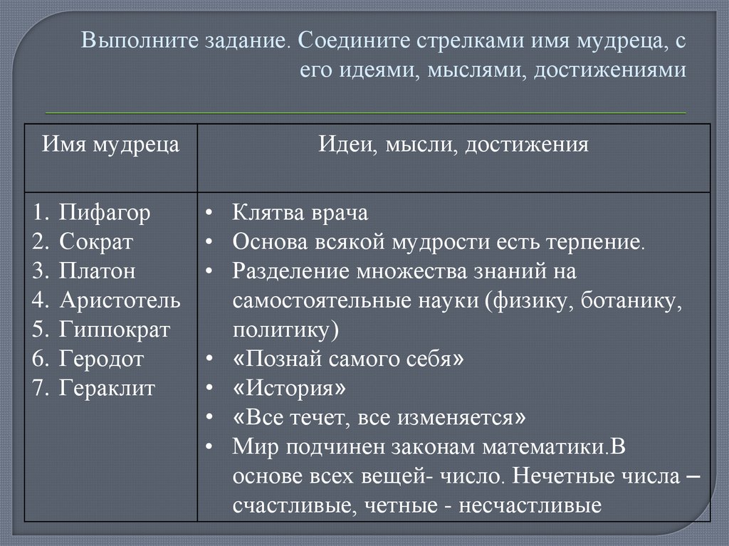 Выполните задание. Соедините стрелками имя мудреца, сего идеями, мыслями, достижениями