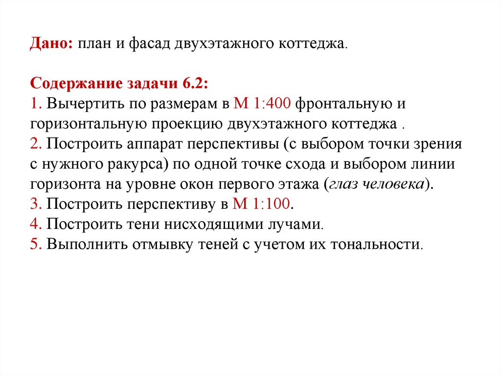 Дано: план и фасад двухэтажного коттеджа.Содержание задачи 6.2: