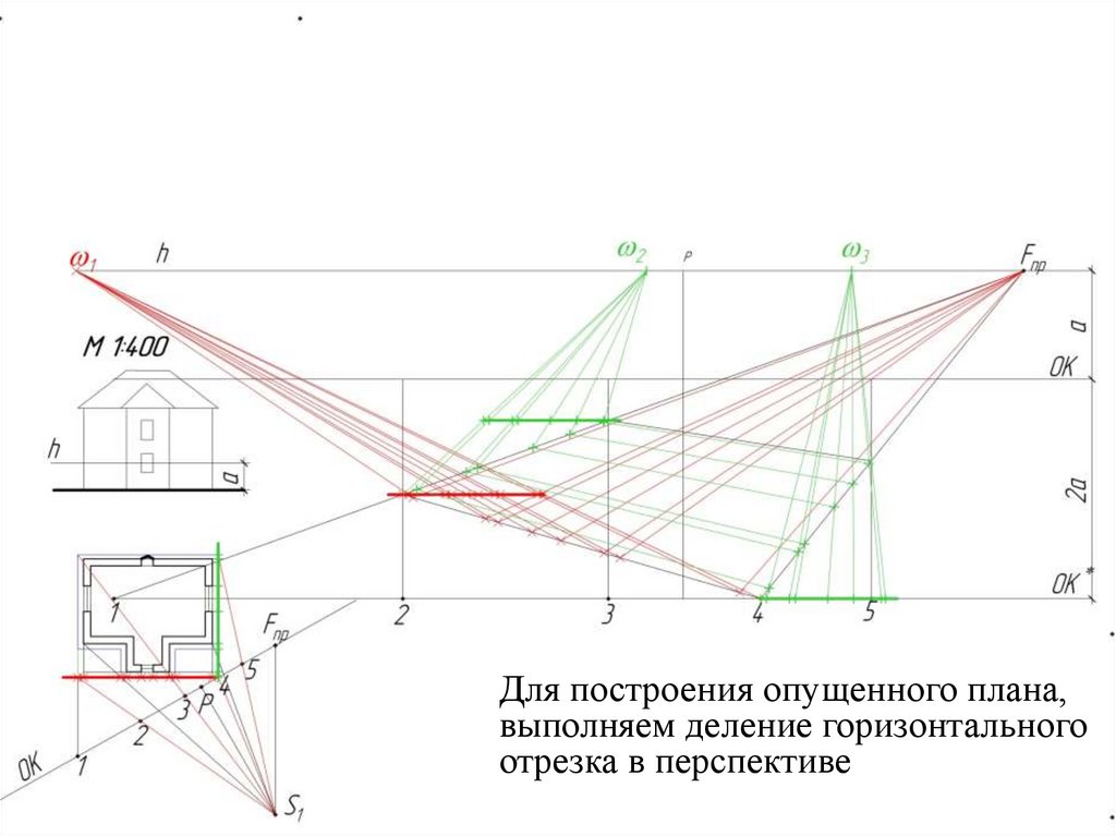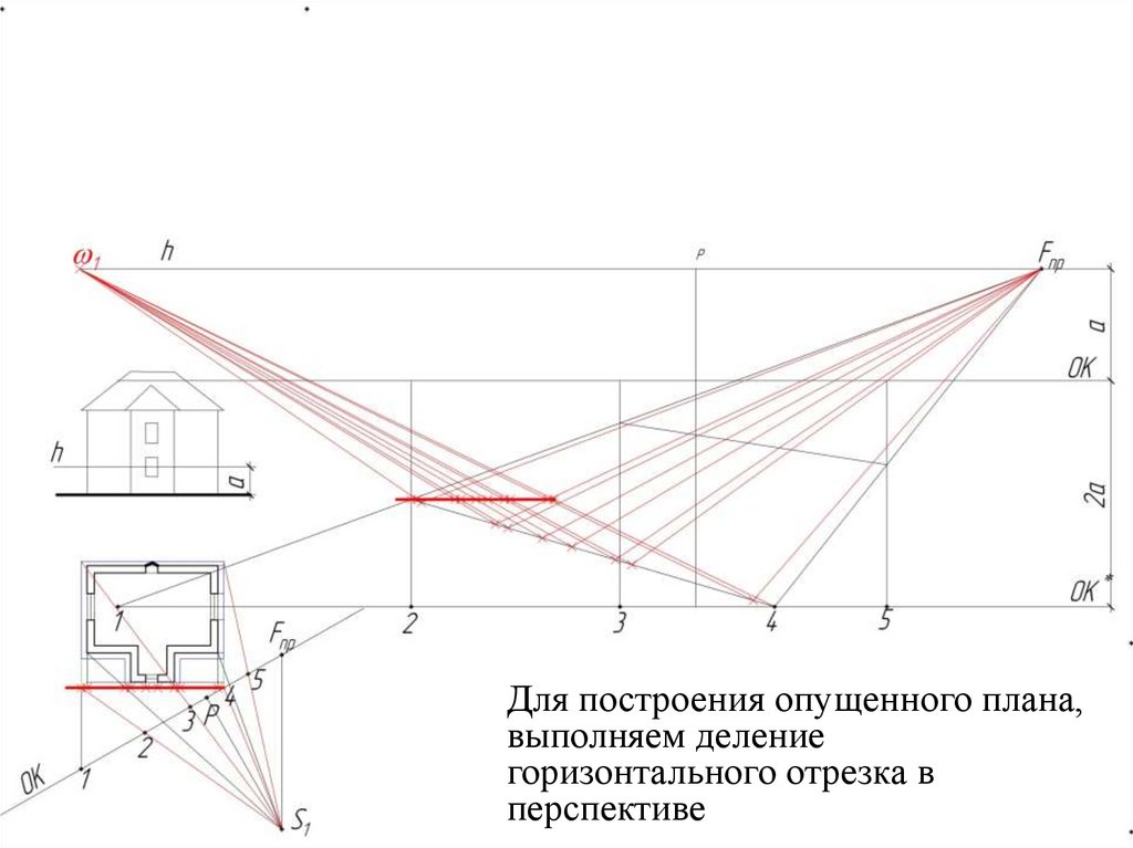 Для построения опущенного плана,выполняем деление горизонтального