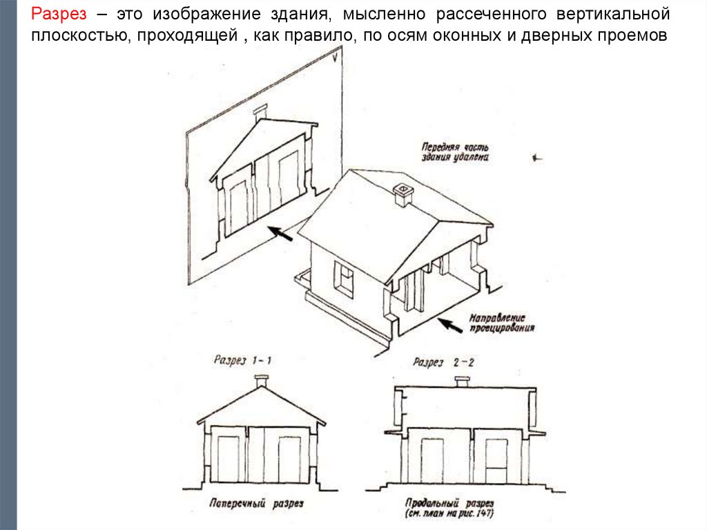 Разрез – это изображение здания, мысленно рассеченного вертикальнойплоскостью, проходящей , как правило, по осям оконных и дверных проемов