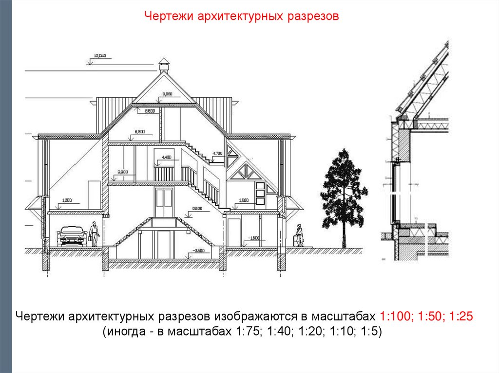 Чертежи архитектурных разрезовЧертежи архитектурных разрезов изображаются в масштабах 1:100; 1:50; 1:25
