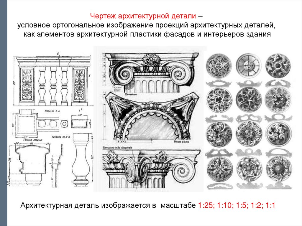 Архитектурная деталь изображается в масштабе 1:25; 1:10; 1:5; 1:2; 1:1