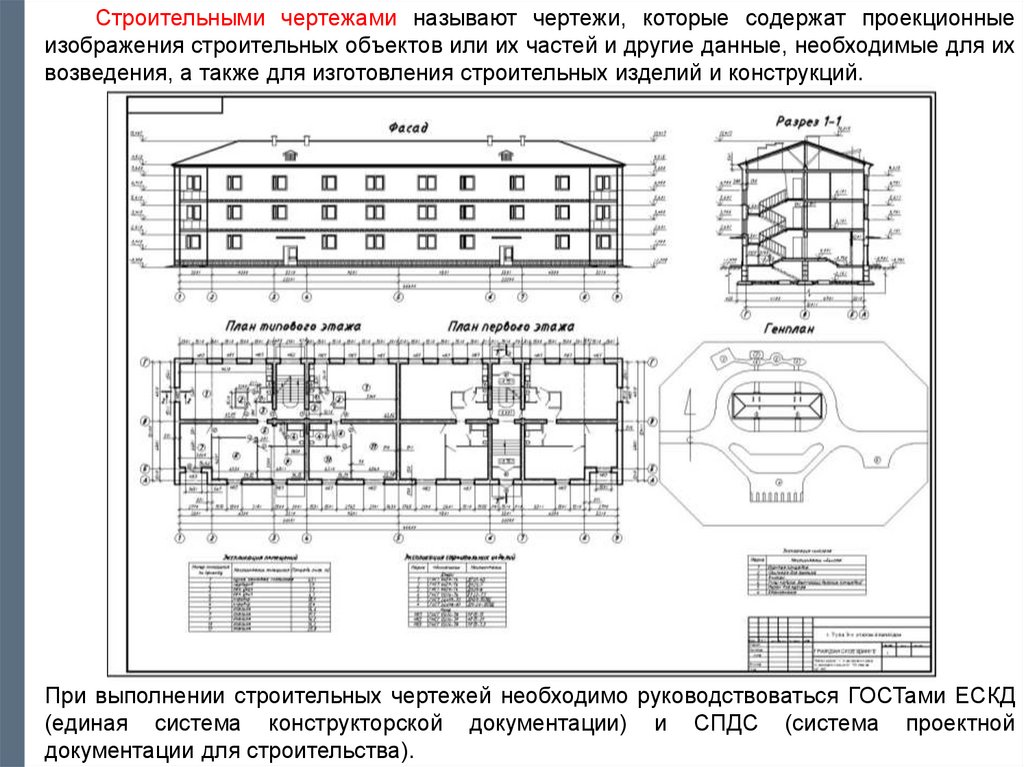 При выполнении строительных чертежей необходимо руководствоваться ГОСТами ЕСКД