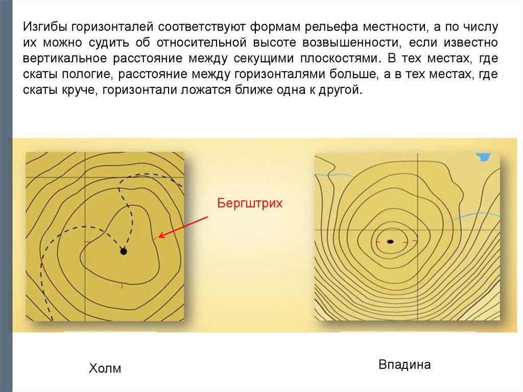 Изгибы горизонталей соответствуют формам рельефа местности, а по числуих можно судить об относительной высоте возвышенности, если известно