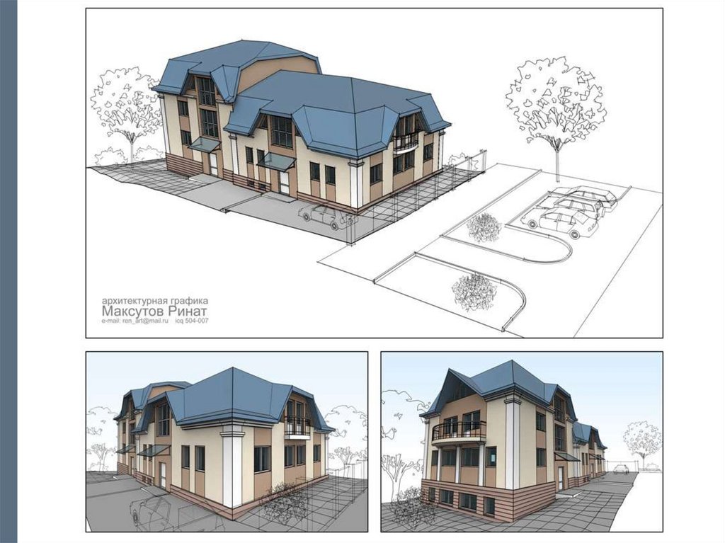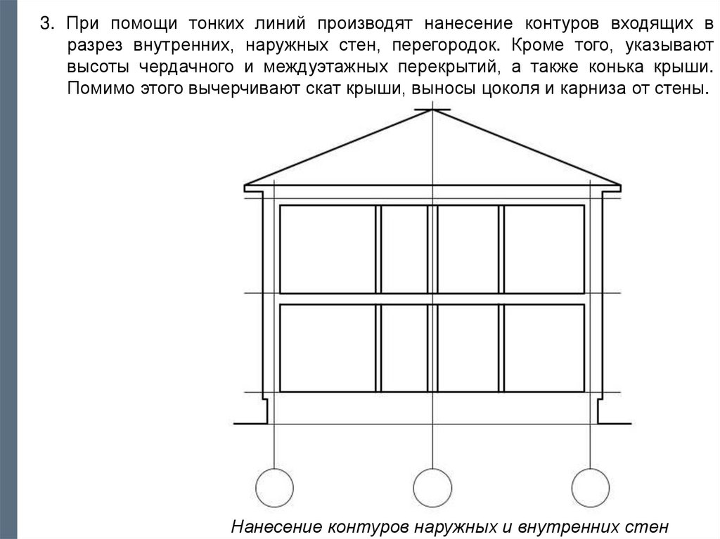 Помимо этого вычерчивают скат крыши, выносы цоколя и карниза от стены.
