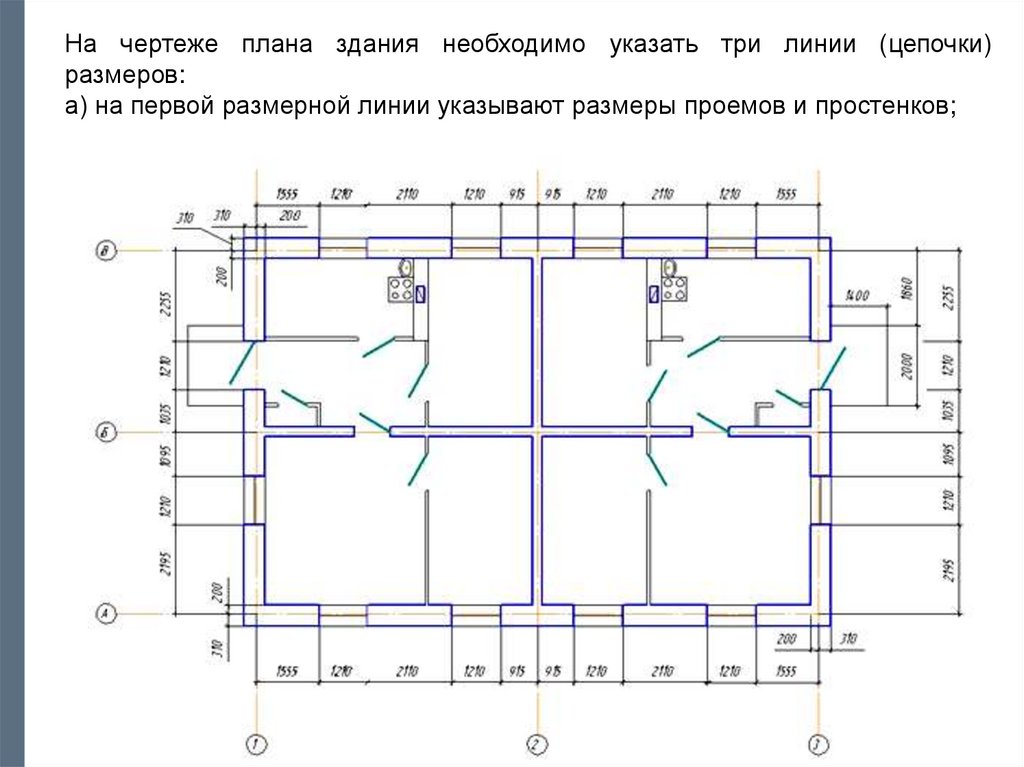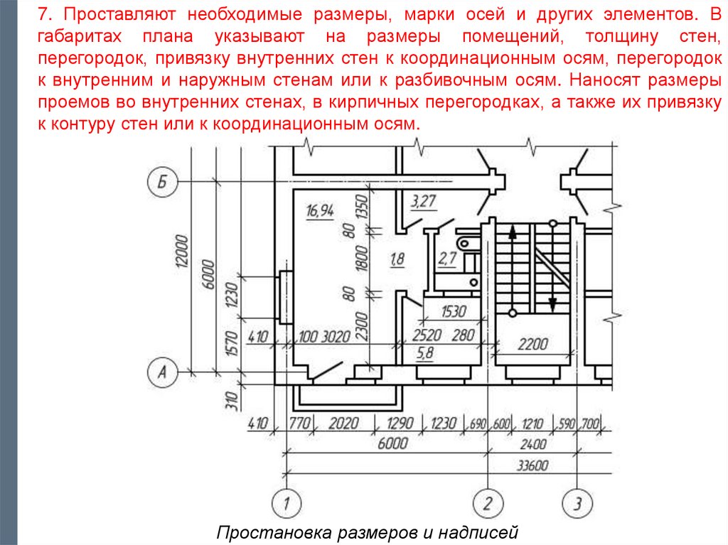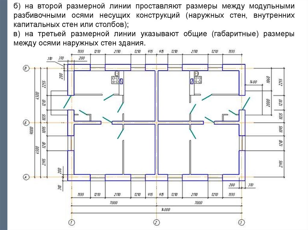 к внутренним и наружным стенам или к разбивочным осям. Наносят размеры