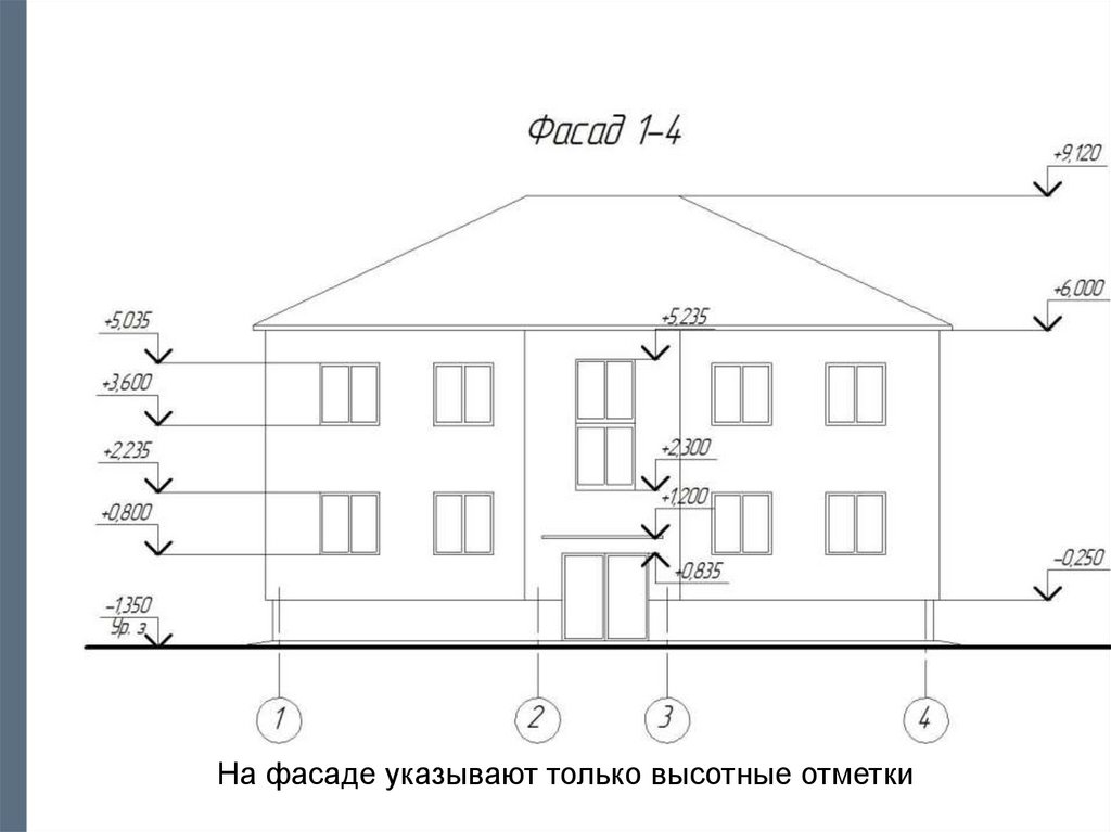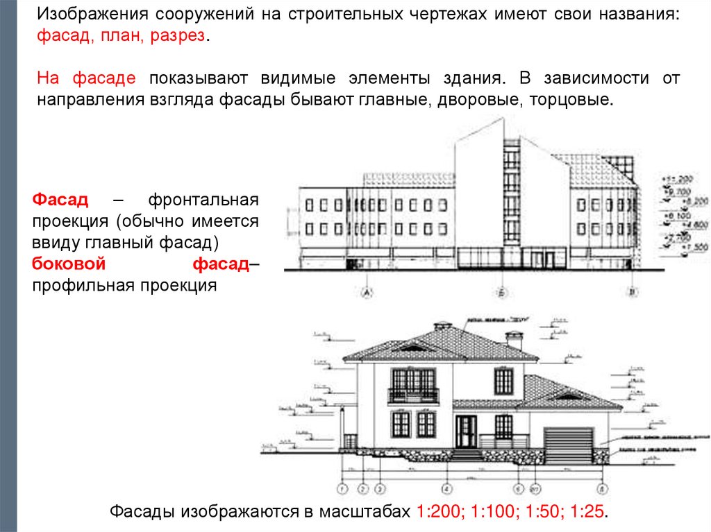 Фасады изображаются в масштабах 1:200; 1:100; 1:50; 1:25.