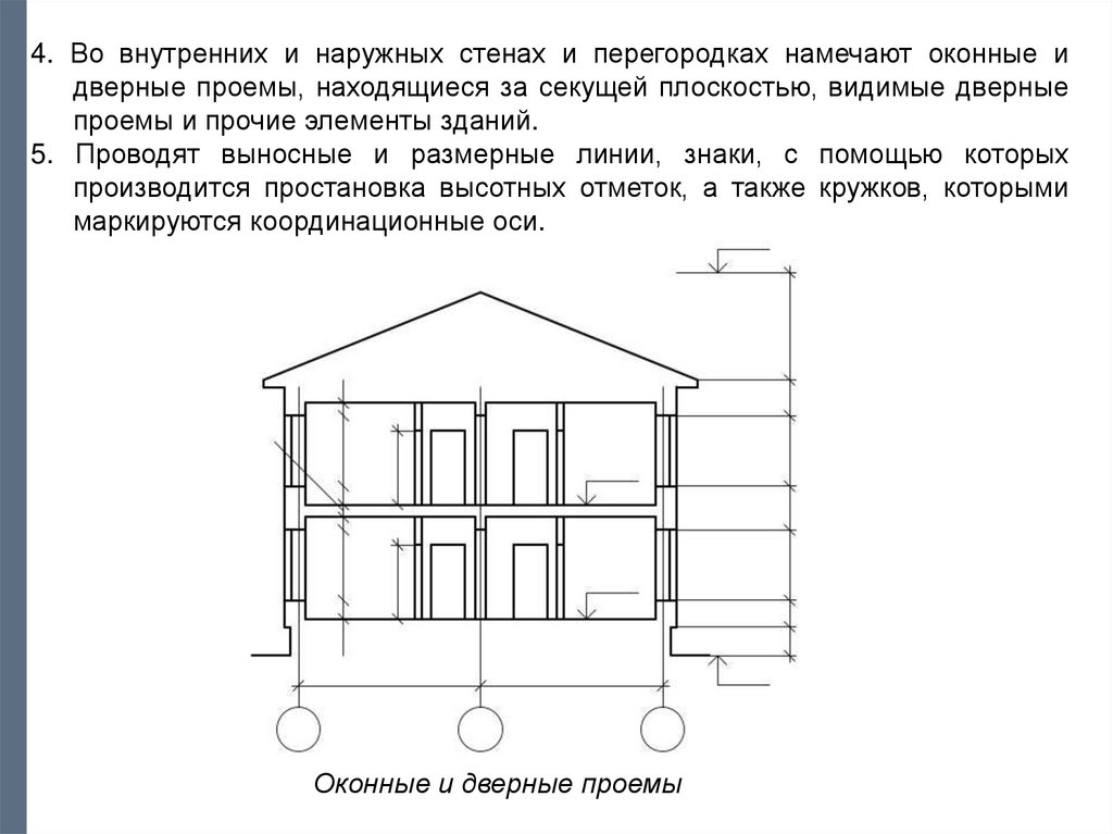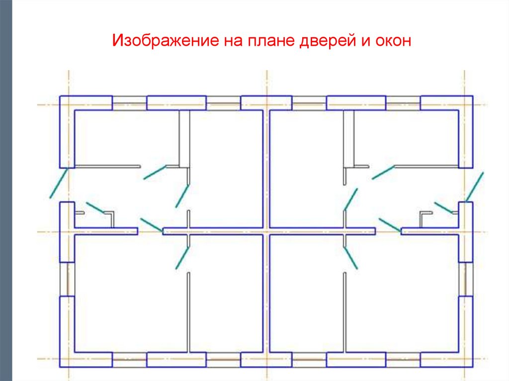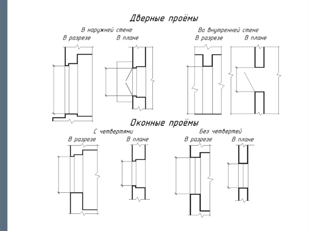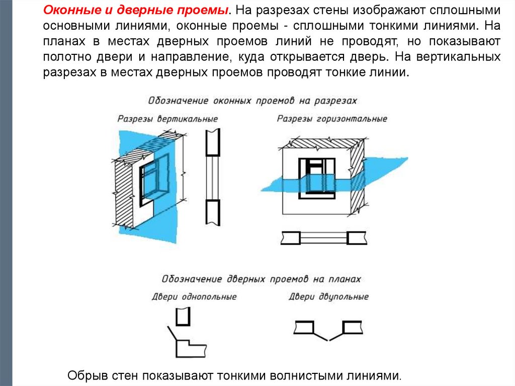 Оконные и дверные проемы. На разрезах стены изображают сплошнымиосновными линиями, оконные проемы - сплошными тонкими линиями. На