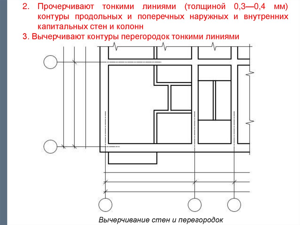 3. При помощи тонких линий производят нанесение контуров входящих вразрез внутренних, наружных стен, перегородок. Кроме того, указывают