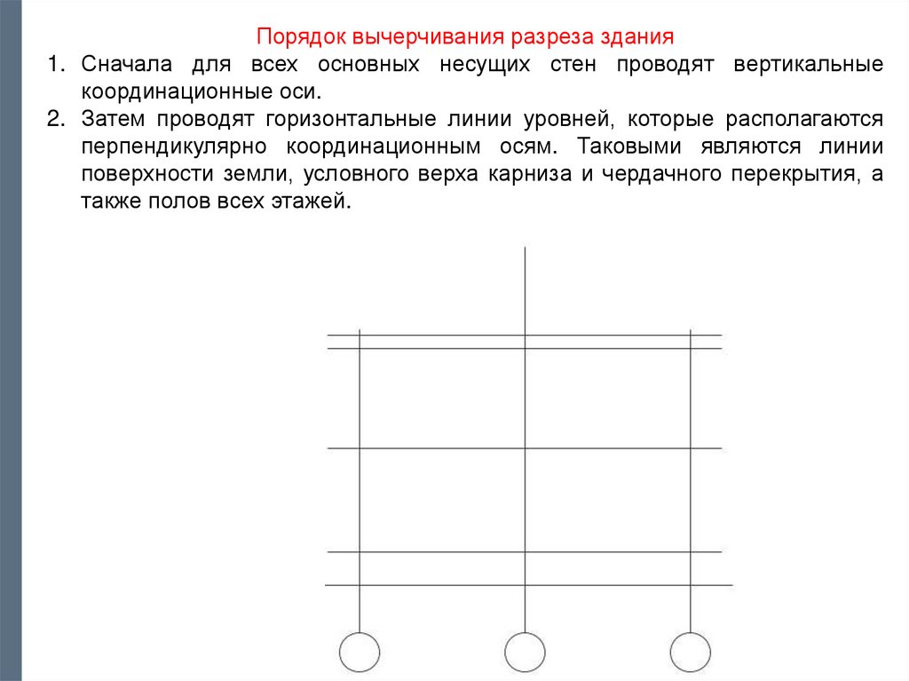 Порядок вычерчивания разреза здания1. Сначала для всех основных несущих стен проводят вертикальные