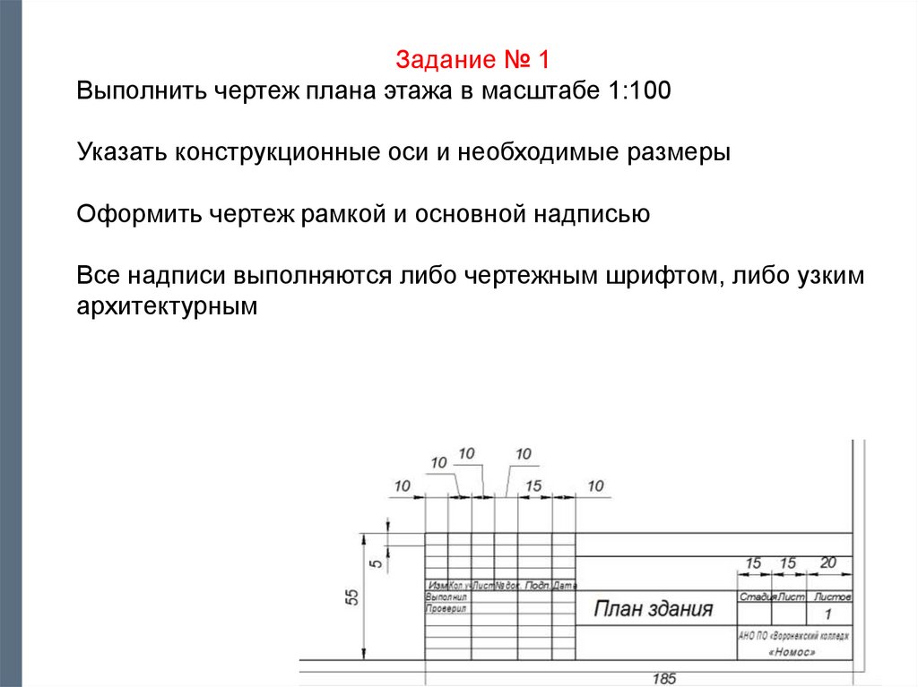 Задание № 1Выполнить чертеж плана этажа в масштабе 1:100