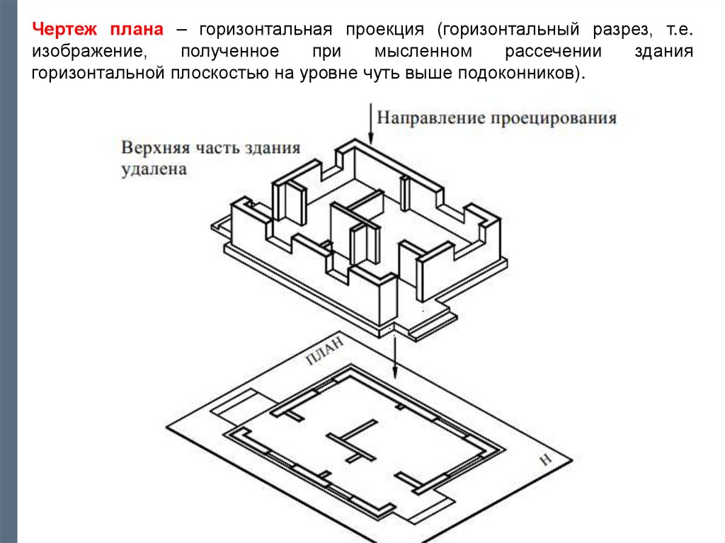 Чертеж плана – горизонтальная проекция (горизонтальный разрез, т.е.изображение,