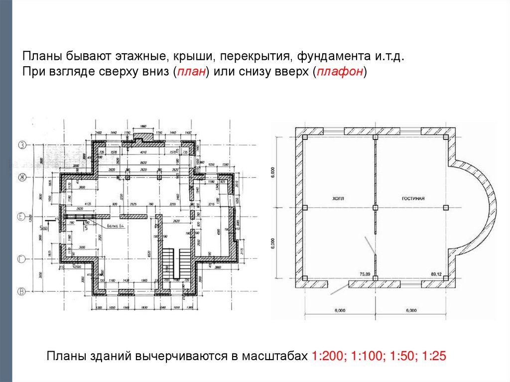Планы зданий вычерчиваются в масштабах 1:200; 1:100; 1:50; 1:25