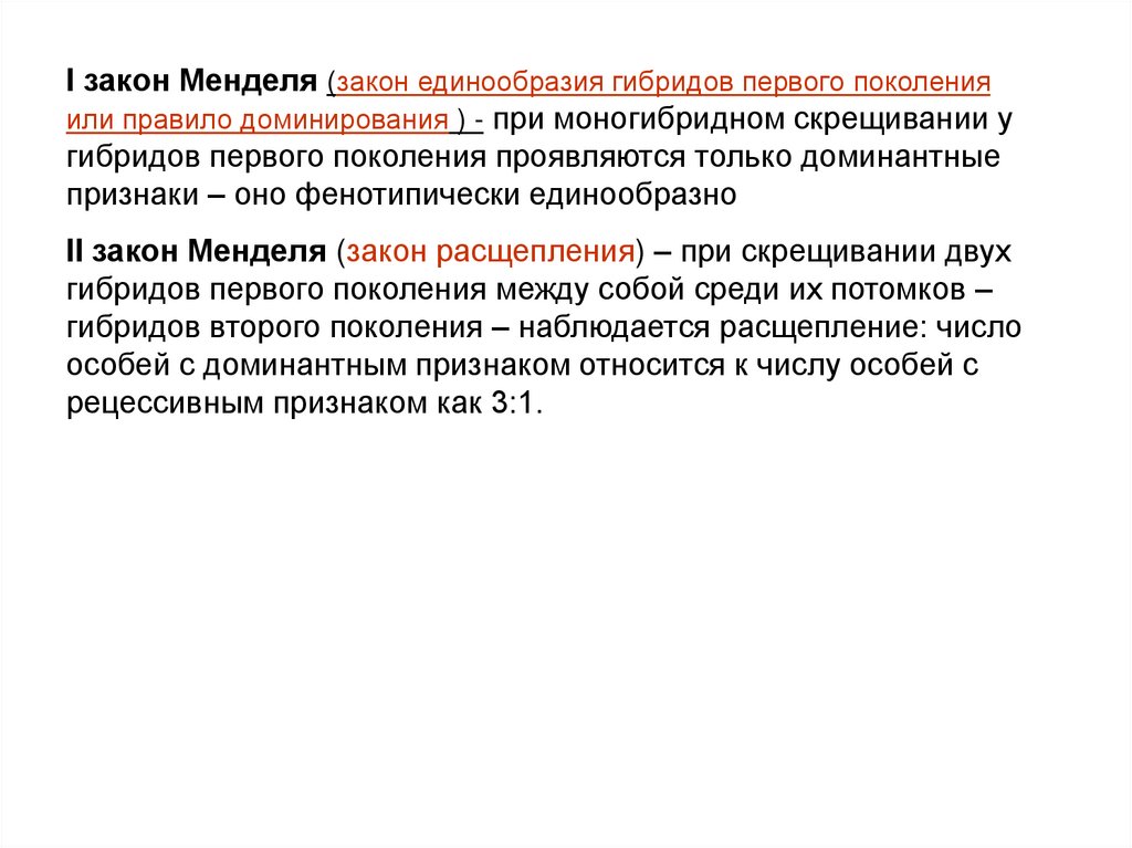 I закон Менделя (закон единообразия гибридов первогопоколения или правило доминирования ) – при
