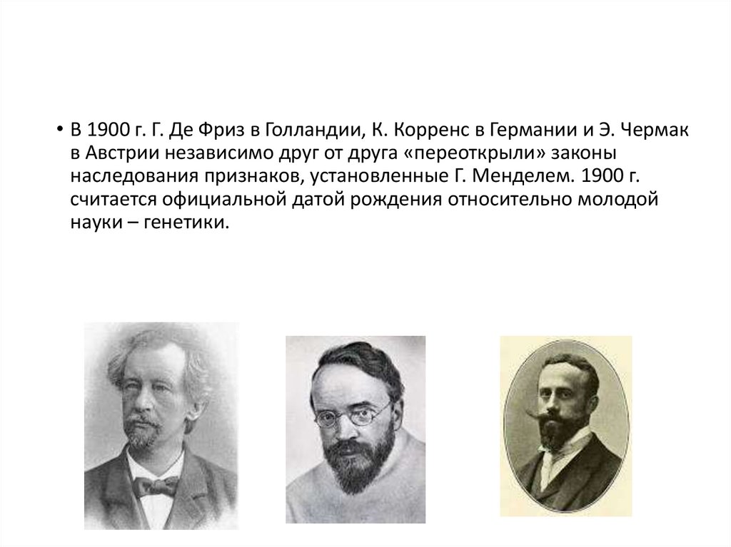 • В 1900 г. Г. Де Фриз в Голландии, К. Корренс в Германии и Э. Чермакв Австрии независимо друг от друга «переоткрыли» законы