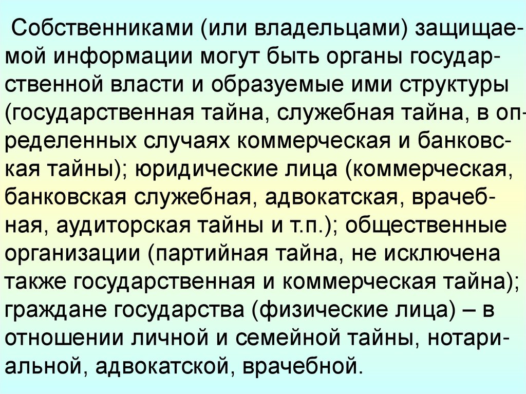Собственниками (или владельцами) защищаемой информации могут быть органы государственной власти и образуемые ими структуры(государственная тайна, служебная тайна, в определенных случаях коммерческая и банковская тайны); юридические лица (коммерческая,