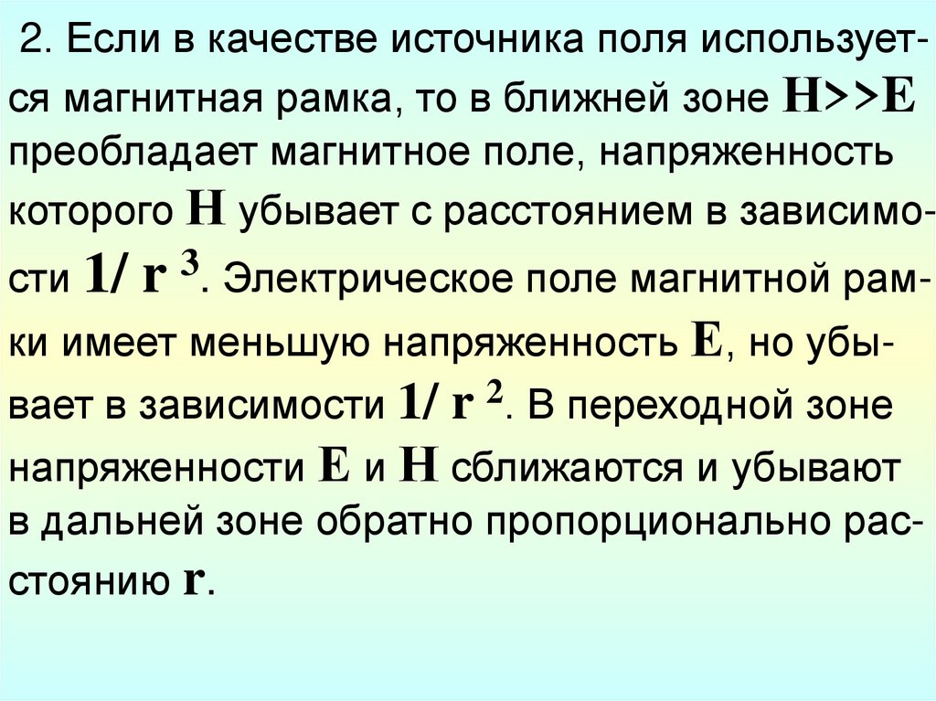 которого Н убывает с расстоянием в зависимости 1/ r 3. Электрическое поле магнитной рамки имеет меньшую напряженность Е, но убывает в зависимости 1/ r 2. В переходной зоне