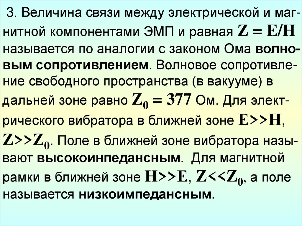 3. Величина связи между электрической и магнитной компонентами ЭМП и равная Z = E/Hназывается по аналогии с законом Ома волновым сопротивлением. Волновое сопротивление свободного пространства (в вакууме) в