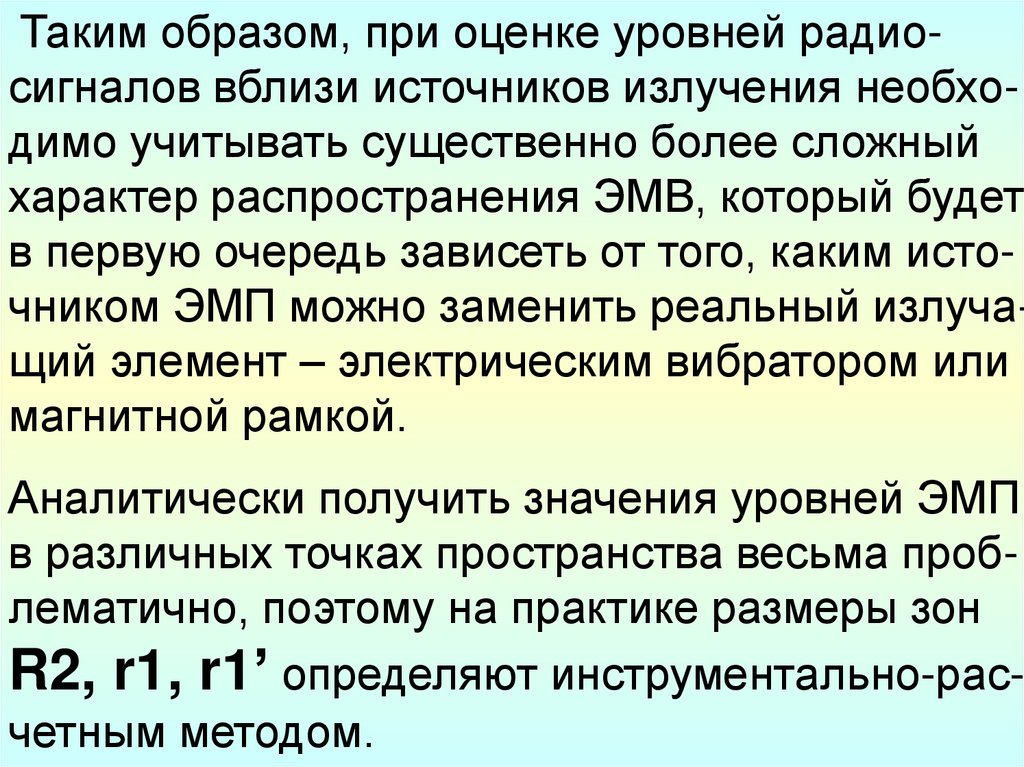 Таким образом, при оценке уровней радиосигналов вблизи источников излучения необходимо учитывать существенно более сложныйхарактер распространения ЭМВ, который будет