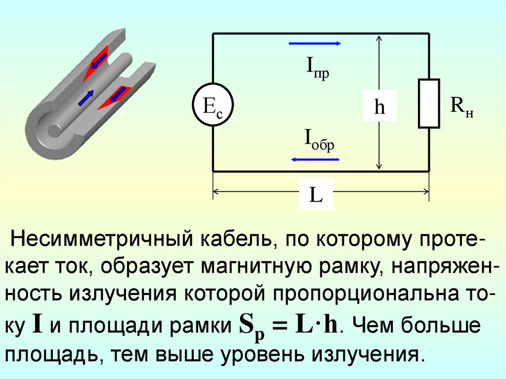 Несимметричный кабель, по которому протекает ток, образует магнитную рамку, напряженность излучения которой пропорциональна току I и площади рамки Sp = L·h. Чем больше