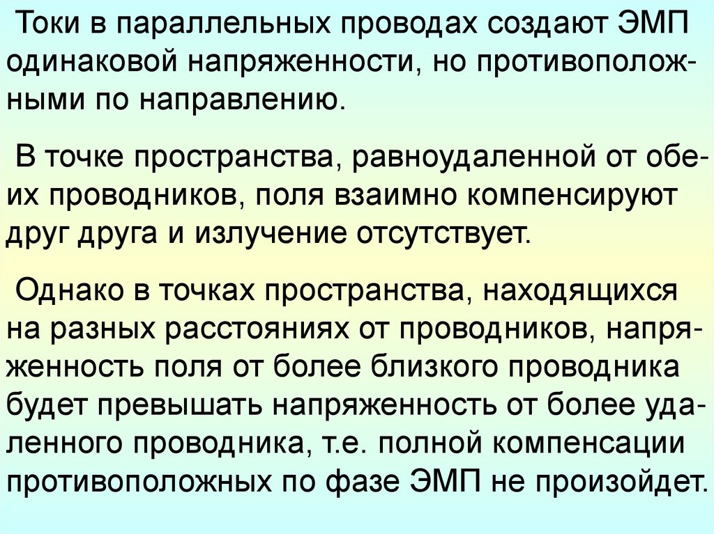 Токи в параллельных проводах создают ЭМПодинаковой напряженности, но противоположными по направлению.