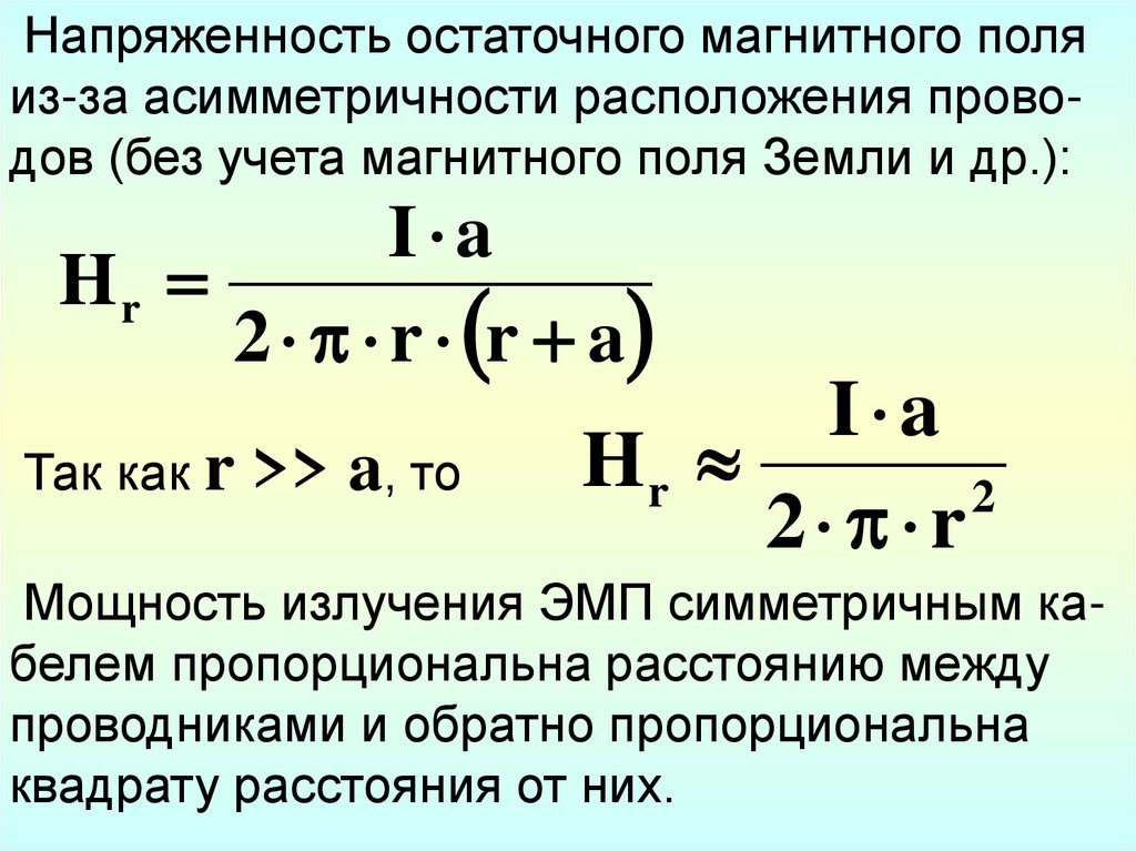 Напряженность остаточного магнитного поляиз-за асимметричности расположения проводов (без учета магнитного поля Земли и др.):