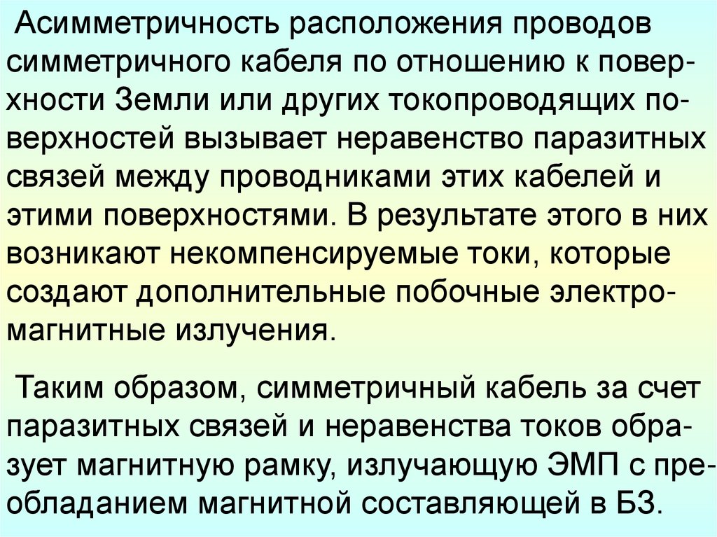 Асимметричность расположения проводовсимметричного кабеля по отношению к поверхности Земли или других токопроводящих поверхностей вызывает неравенство паразитных