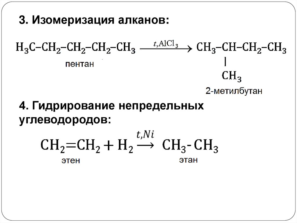 3. Изомеризация алканов:4. Гидрирование непредельных