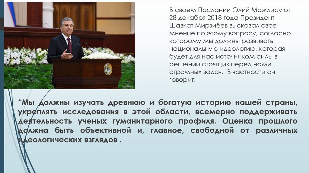 В своем Послании Олий Мажлису от28 декабря 2018 года Президент