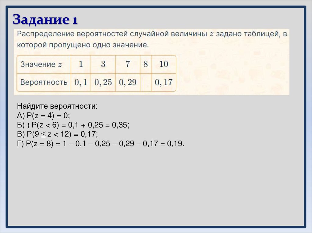 Г) Р(z = 8) = 1 – 0,1 – 0,25 – 0,29 – 0,17 = 0,19.