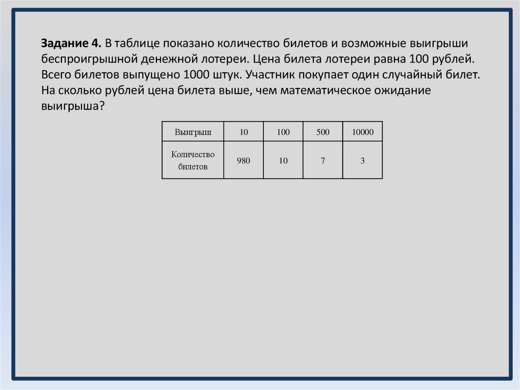 Задание 4. В таблице показано количество билетов и возможные выигрышибеспроигрышной денежной лотереи. Цена билета лотереи равна 100 рублей.