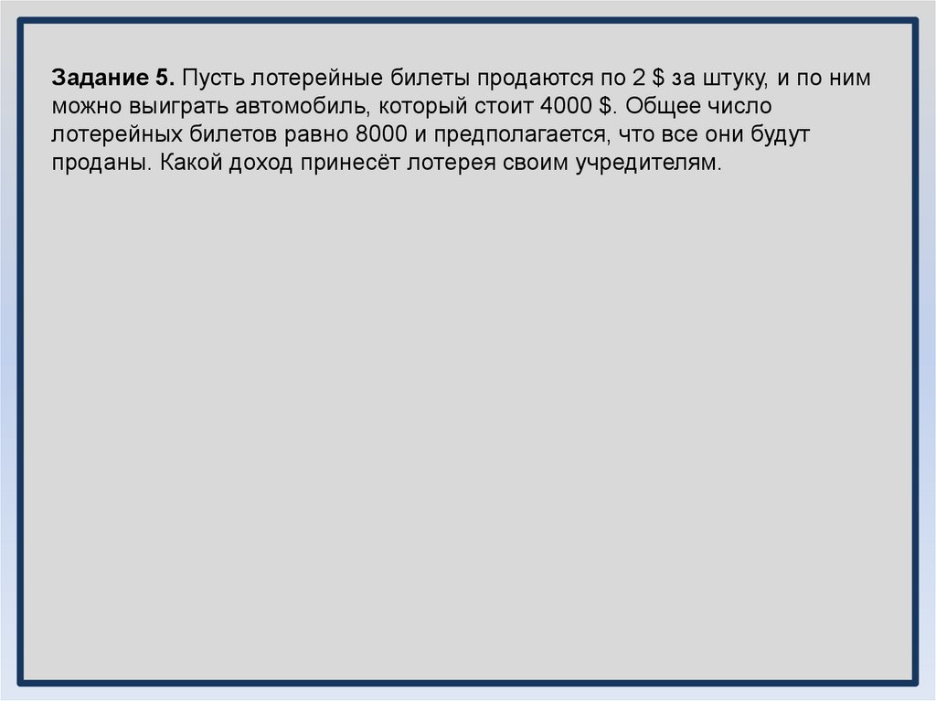 Задание 5. Пусть лотерейные билеты продаются по 2 $ за штуку, и по нимможно выиграть автомобиль, который стоит 4000 $. Общее число