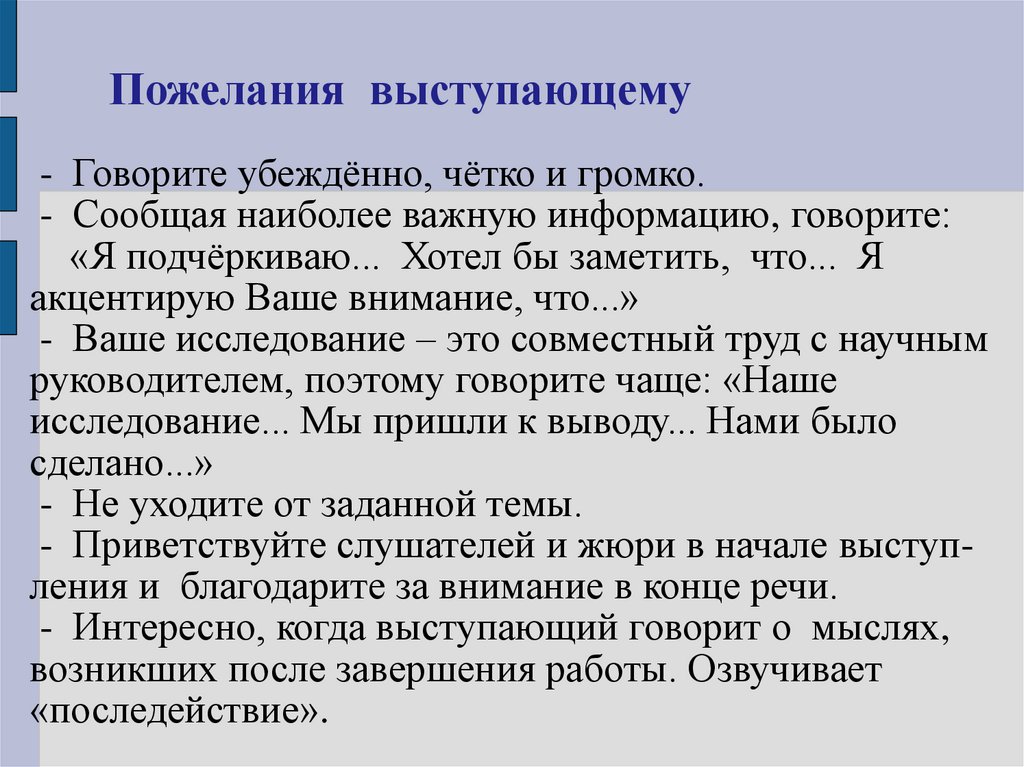 Пожелания выступающему- Говорите убеждённо, чётко и громко.